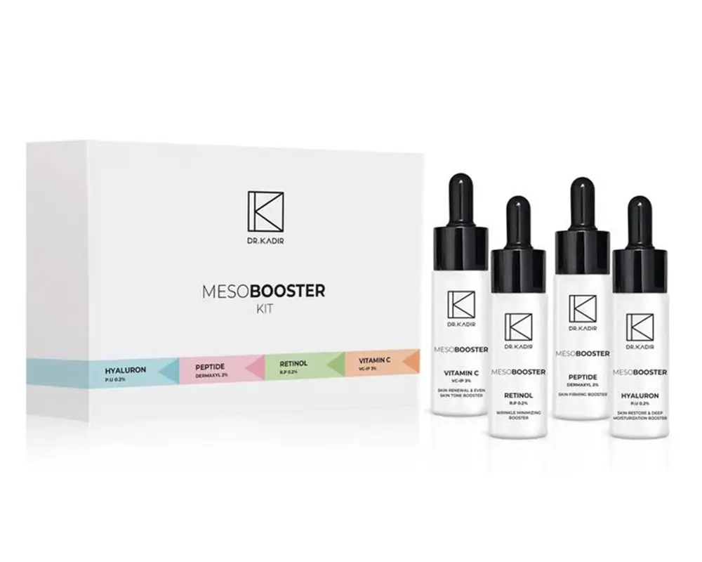 ערכת מזו בוסטר של 4 בוסטרים אנטי אייג’ | רון כדיר, לשיפור מרקם העור, הפחתת קמטים באזור האף והפה, אפקט מילוי בזק – נראתה הרמה מיידית של הפנים. אפקט זה נראה במחקר תוך שעה ונמשך עד כשש שעות. מכיל 4 מוצרים של 30 מל כל אחד.