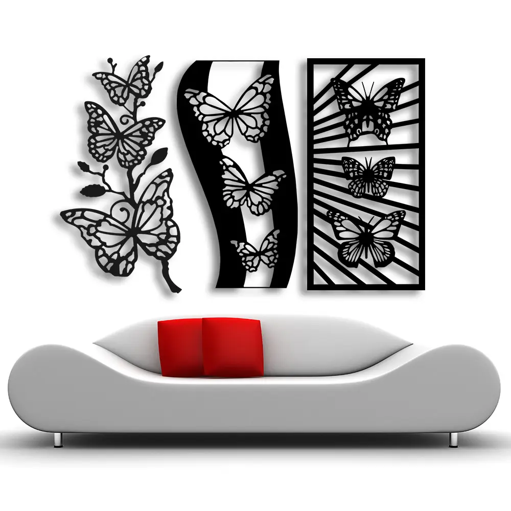 תמונה של פרפרים במעוף חיתוך לייזר מתכת לתלייה | התמונה הזו חתוכה בלייזר בעדינות ממתכת איכותית, מציגה 3 דגמים של עיטורי פרפרים במעוף בקווים סימטריים עדינים